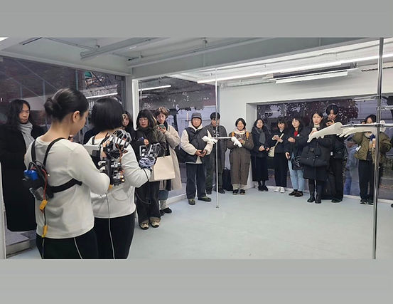 In addition, I chose an alternative method of recording by backing up and reproducing the movements by entering the movements into a suit, rather than just recording them on video as in previous works. The glove (suit) acts as a medium to connect the performer's hand movements. It is a device that enables interconnection between two performers, so that the receiving performer can track and experience the original gesture.